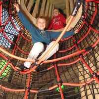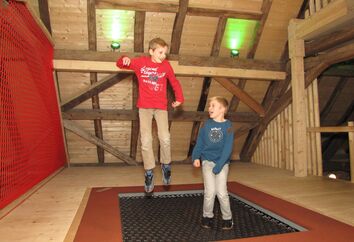 Vier Etagen laden ein zu einem Spielespaß der besonderen Art. Mutige klettern über die Kletterwand in die nächste Etage, wo ein luftiger Netztunnel und eine große Bauecke mit riesigen Bausteinen warten. Über eine Schräge mit Halteseil geht es weiter nach oben zum Holztunnel und Trampolin. Verschiedene Netztunnel verbinden die Spielebenen waagerecht und senkrecht miteinander, so dass hier ein munteres Treiben herrscht. Von ganz oben geht es über eine lange Röhrenrutsche ins Erdgeschoss zurück.