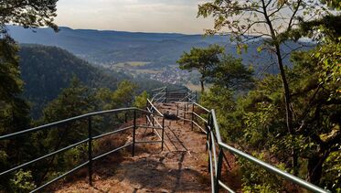 Bei Bundenthal, 2 km vom Parkplatz „Auf der Steige“. Aussichtsfelsen mit Windrose und fantastischer Panoramasicht. Er liegt direkt am neuen Premiumweg „Bären-Steig“.