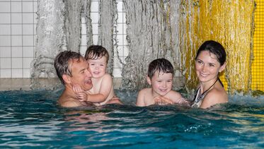Familienfreundliche Wasser-Erlebniswelt mit Rutsche, Wellenbad, Massagebecken und großer, moderner Saunalandschaft.