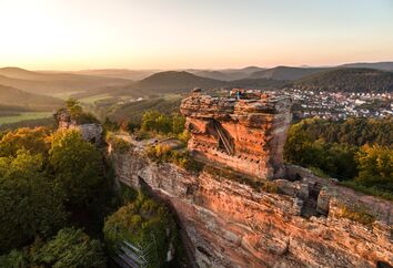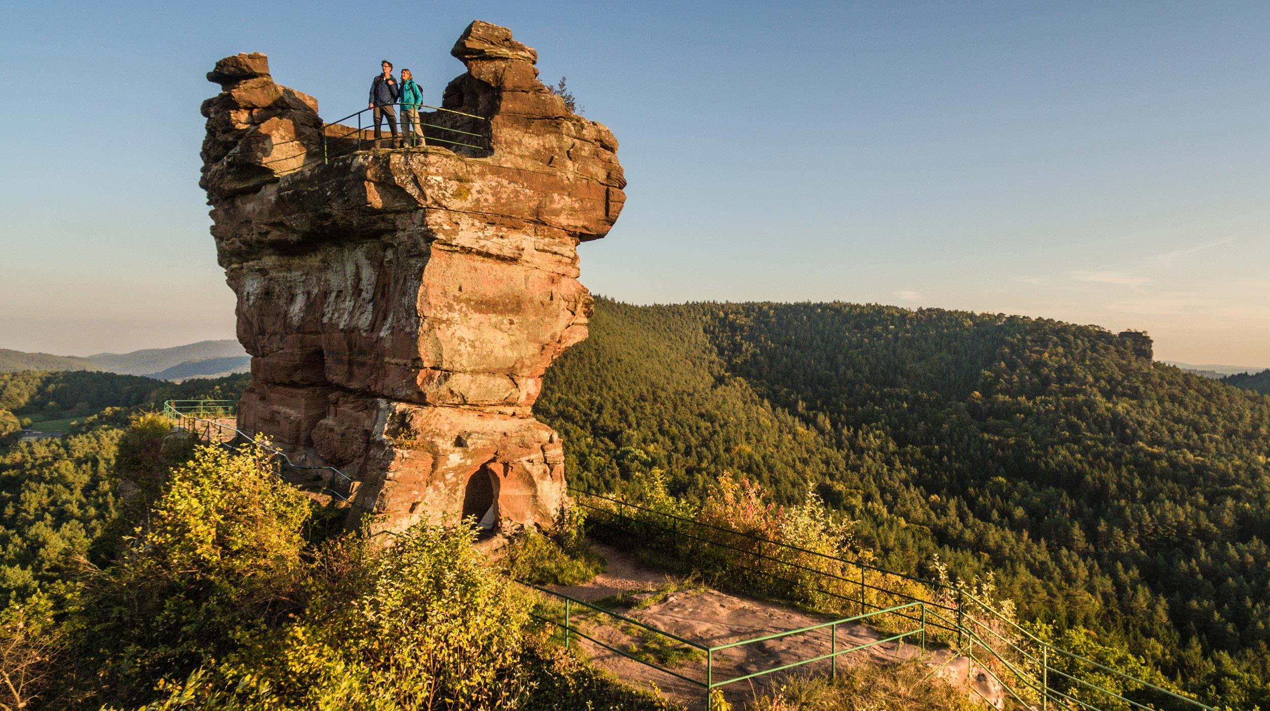 Der Drachenfels zählt zu den Hauptanziehungspunkten im Wasgau. Er ist vermutlich kurz nach 1200 errichtet worden. 1523 wurde die Burganlage fast völlig zerstört. Zwei steile und sehr schmale Buntsandsteinfelsen tragen die eindrucksvollen Ruinen der Burg Drachenfels. Das größte und am besten erhaltene Bauwerk ist der mächtige östliche Torbau. Ebenfalls erhalten sind zahlreiche Felsenkammern und Verbindungsgänge. Das Wahrzeichen der Burg (Umrisse einer Drachenfigur) war in der östlichen Wand der Kernanlage eingeritzt, wurde jedoch später teilweise beschädigt. Von der Burgruine hat man einen herrlichen Ausblick über das Biosphärenreservat Naturpark Pfälzerwald/Nordvogesen.