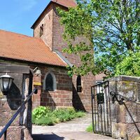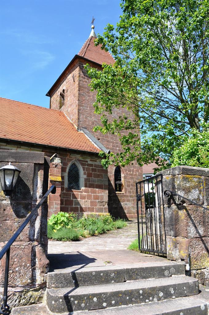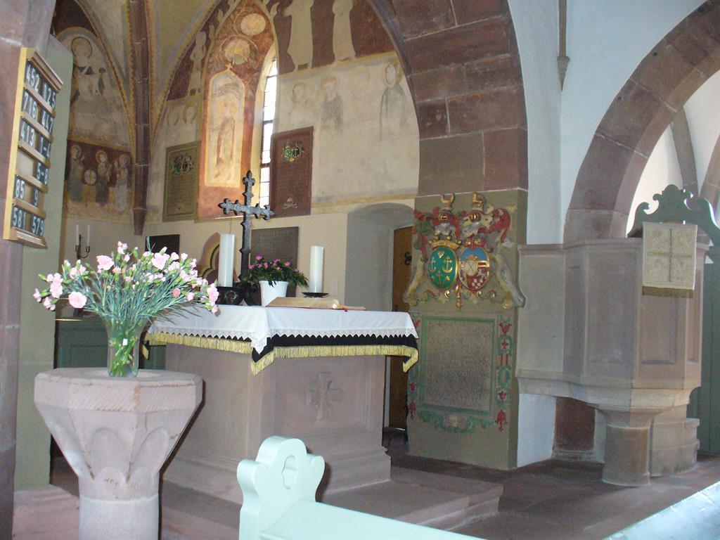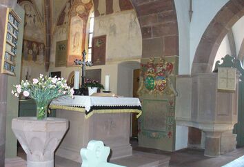 Der um 1200 entstandene romanische Chorturm und das um 1320 entstandene gotische Kirchenschiff bilden durch den warmen Ton des roten und gelben Sandsteins eine Einheit. Im Innern sind die Schlusssteine des Kreuzrippengewölbes figürlich ausgestaltet. Die herrlichen, sehr bekannten Fresken stammen aus dem Jahr 1300 und wurden erst wieder 1908 entdeckt und freigelegt.