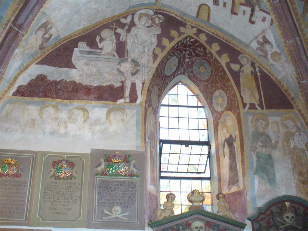 Die Herrschaftsgeschlechter Steinkallenfels und Catchart zu Carbiston benutzen die Kirche als Grablege. Prächtige Epitaphien schmücken den Chorraum. Unter dem Altar befindet sich die Gruft mit den Gebeinen der Adelsfamilien.