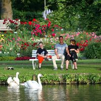 Das Wahrzeichen der Stadt und Anziehungspunkt nicht nur für Gartenfreunde aus aller Welt ist der Zweibrücker Rosengarten - eine grüne Oase inmitten der Stadt. Für die Königin der Blumen wurde hier der Hofstaat gepflanzt. Mehr als 1.500 verschiedenen Rosensorten blühen und gedeihen in einer stilvoll gestalteten Umgebung von Gehölzen, Blumen und Weihern auf über 50.000 qm. Begonnen hat die Entwicklung des Rosengartens bereits im Jahre 1912, als der Verein Pfälzer Rosenfreunde den Beschluss fasste, in Zweibrücken eine Freiland-Rosenschau durchzuführen. Am 20. Juni 1914 konnte der Zweibrücker Rosengarten dann feierlich von Prinzessin Hildegard von Bayern eröffnet werden. Bereits zu dieser Zeit blühten auf einer Fläche von 26.400 qm über 42.000 Rosen. Nach seiner vollständigen Zerstörung durch Luftangriffe im März 1945 waren es wiederum Mitglieder des Vereins Pfälzer Rosenfreunde, die den Garten zu neuem Leben erweckten und im Jahre 1948 seine Wiedereröffnung feierten. Im Laufe der Jahre wurde die Parkanlage mehrfach erweitert und umgestaltet und erstrahlt im Jahr 2004 unter dem Motto „90 Jahre Zweibrücker Rosenzauber“ in ihrer ganzen Pracht. Der Stil der 50er Jahre ist noch zu finden, gepaart mit moderner architektonischer Gestaltung. Gerade diese Symbiose macht den unverwechselbaren Charme der Parkanlage aus – und natürlich auch die unzähligen Frühjahrsblüher, Bäume, Sträucher, Gräser, Sommer- und Herbstflor, Pavillons, Brunnen, Skulpturen und vieles mehr. „Europas Rosengarten“ schafft Beziehungen weit über die Grenzen hinaus, so finden Kenner hier beispielsweise das größte französische Rosensortiment in Deutschland. Der Kulturpark „Europas Rosengarten“ ist jedoch keinesfalls nur botanischer Garten, sondern auch Schauplatz zahlreicher kultureller Veranstaltungen. Jeden Sonntagnachmittag von Mai bis September lädt die Rosengarten- Konzertreihe zu Freiluft-Kultur und zahlreiche Sonderveranstaltungen wie Familientag mit Picknick im Park, Klassik Open-Air, Freilicht- Theater, Fest der 1000 Lichter und vieles mehr verzaubern die Besucher. Auch Lehrreiches steht für Sie auf dem Programm: Was Sie schon immer über Rosen wissen wollten, verraten Ihnen die Rosengärtner in regelmäßig stattfindenden Seminaren. Tipps und Tricks „quer durch den Garten“ erfahren die Besucher bei einer fachkundigen Führung.