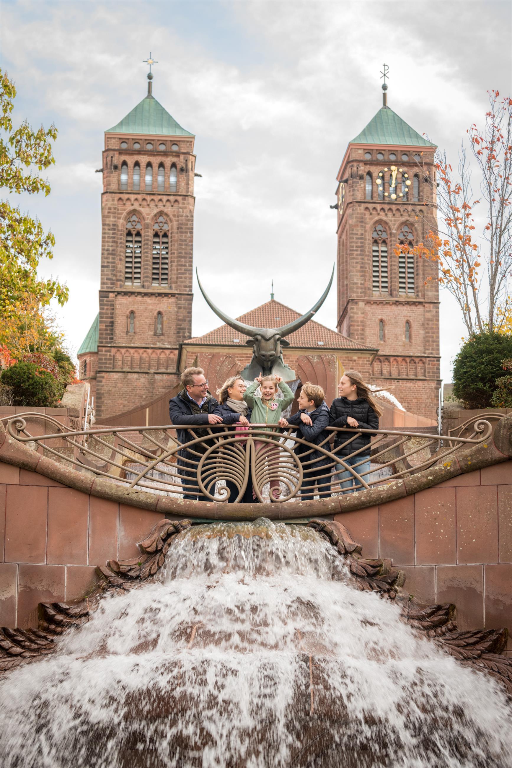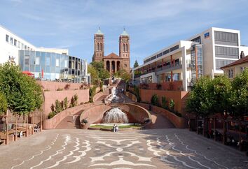 Mitten in der Pirmasenser Fußgängerzone, findet sich das imposante Wahrzeichen der Stadt. Darüber ragt der Stierkopf und die Pirminius-Kirche, die zusammen einen einmaligen Blick bilden.