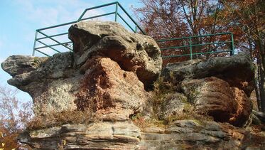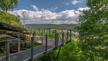 Buntsandsteinfelsen mit Sitzgelegenheiten und Aussichtsplattform oberhalb der Stadt Rodalben.