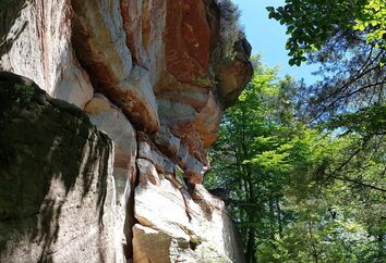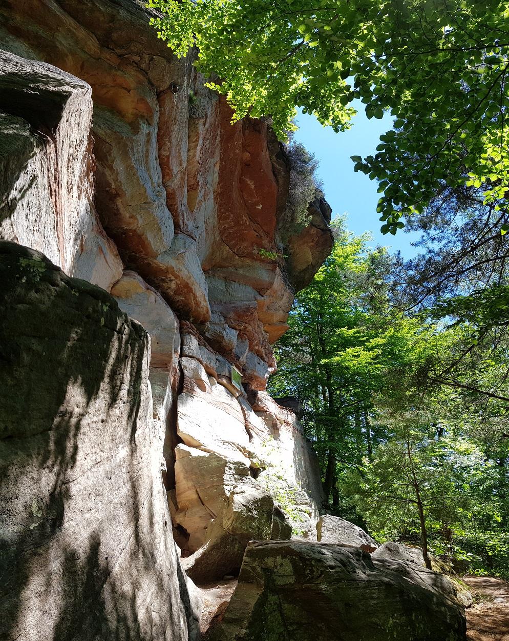 Südlich von Leimen/Pfalz im Gräfensteiner Land, an einem wildromantischen Bergpfad zum Kippkopf gelegene, beeindruckende Felsformationen aus Buntsandstein, die gerne von Kletterern genutzt werden. Am hellen Fels kann man auch dunkle Eisenoxid-Verwitterungen und fossile Einschlüsse entdecken. Ein Stück weiter, von einem Felsplateau oberhalb des Geißenschlupf aus, hat man dann eine phantastische Aussicht und findet zudem einen gemütlichen Rastplatz vor.