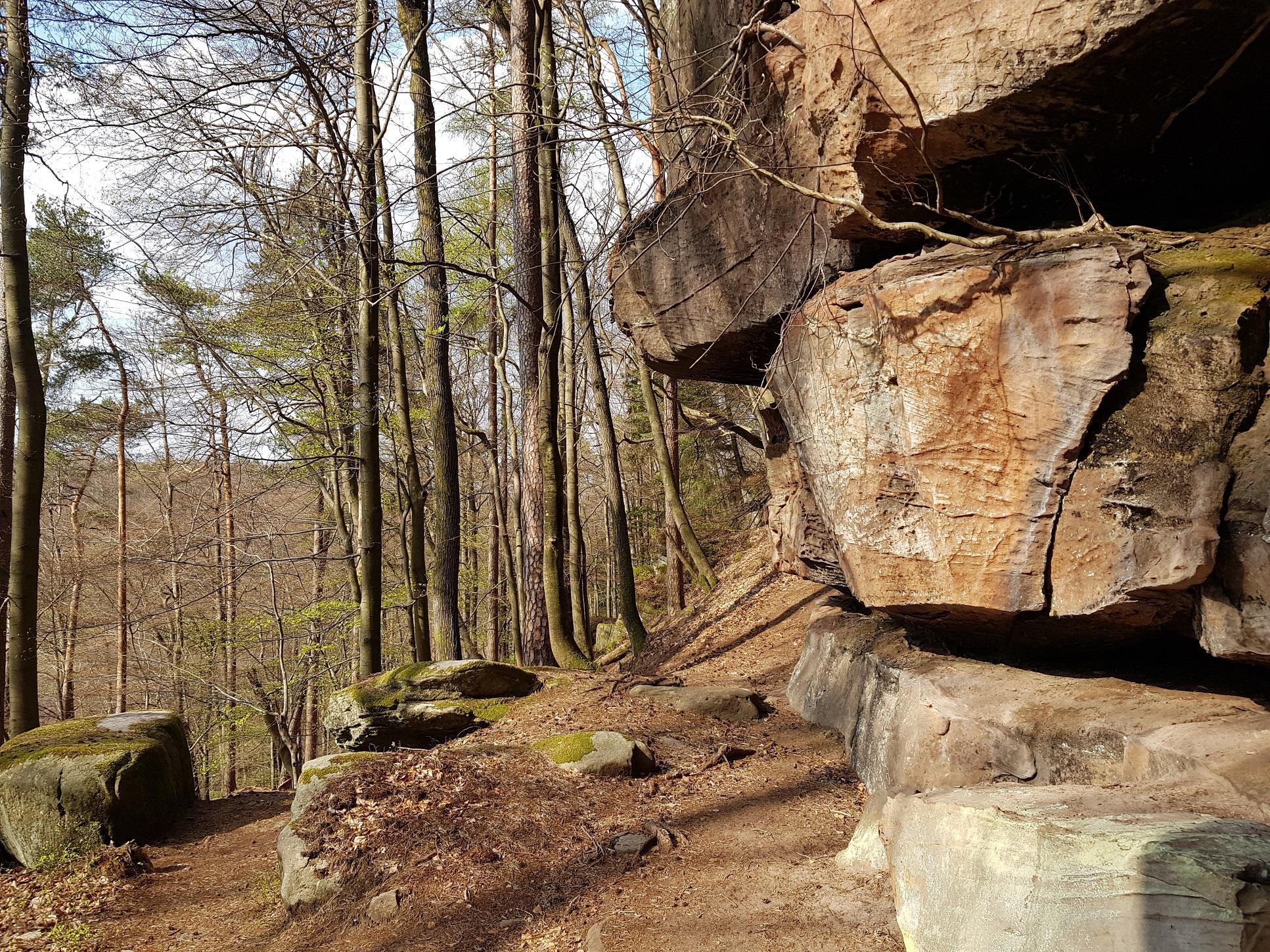 Teufelstisch, Braut & Bräutigam, Jungfernsprung… die Namen und Legenden die sich um sie ranken sind fast so bizarr wie ihre Erscheinung. Der Bundsandstein und die daraus bestehenden Felstürme bestimmen die Landschaft des Pfälzerwalds. Entstanden sind sie im Perm und Trias vor über 250 Millionen Jahren, als sich über 500 m mächtige Sedimentschichten im Gebiet des heutigen Pfälzerwaldes abgelagert haben. Durch Beimengungen von Eisenoxid erhielten sie ihre charakteristische rote Farbe. Ihre heutige Form erhielten sie durch die Erosion der letzten 5 Millionen Jahre. Im Mittelalter dienten sie nicht nur als Sockel oder Fundament für die unzähligen Burgen, sondern wurden auf Grund ihrer leichten Bearbeitbarkeit, häufig in den Burgbau mit einbezogen.