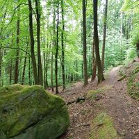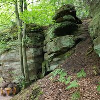 Teufelstisch, Braut & Bräutigam, Jungfernsprung… die Namen und Legenden die sich um sie ranken sind fast so bizarr wie ihre Erscheinung. Der Bundsandstein und die daraus bestehenden Felstürme bestimmen die Landschaft des Pfälzerwalds. Entstanden sind sie im Perm und Trias vor über 250 Millionen Jahren, als sich über 500 m mächtige Sedimentschichten im Gebiet des heutigen Pfälzerwaldes abgelagert haben. Durch Beimengungen von Eisenoxid erhielten sie ihre charakteristische rote Farbe. Ihre heutige Form erhielten sie durch die Erosion der letzten 5 Millionen Jahre. Im Mittelalter dienten sie nicht nur als Sockel oder Fundament für die unzähligen Burgen, sondern wurden auf Grund ihrer leichten Bearbeitbarkeit, häufig in den Burgbau mit einbezogen.