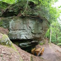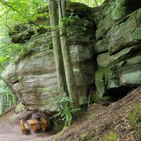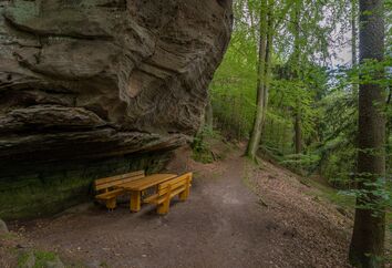 Beim Wüstlangenbachfelsen handelt es sich um eine beindruckende Formation aus Buntsandstein am bekannten Rodalber Felsenwanderweg des Gräfensteiner Landes, unter deren Felsvorsprung eine gemütliche Sitzgruppe steht, an der man auch bei Regen geschützt und trocken rasten, picknicken und verweilen kann.