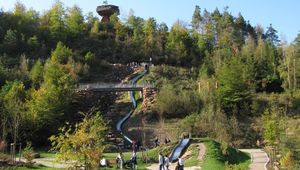 Das Highlight ist ohne Frage die Riesenrutsche mit einer Länge von 50 Metern, die fasziniert nicht nur die Kleinen. Auf dem Wasserspielplatz kann man Wasser pumpen, stauen, leiten und vieles mehr. Außerdem gibt es eine Seilbahn, einen Minigolfplatz und eine Picknickstation.