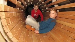 Mutige klettern über die Kletterwand in die nächste Etage, wo ein luftiger Netztunnel und eine große Bauecke mit riesigen Bausteinen warten. Über eine Schräge mit Halteseil geht es weiter nach oben zum Holztunnel und Trampolin. Verschiedene Netztunnel verbinden die Spielebenen waagerecht und senkrecht miteinander, so dass hier ein munteres Treiben herrscht. Von ganz oben geht es über eine lange Röhrenrutsche ins Erdgeschoss zurück.