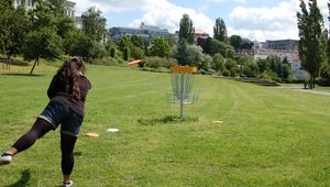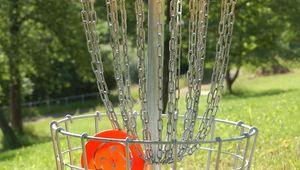 Ihr wundert Euch über die Körbe mit Ketten im Park? Klar – hier wird Discgolf gespielt. Noch nie gemacht? Dann mal los! Entsprechende Discs können an der Kasse im Dynamikum ausgeliehen werden.